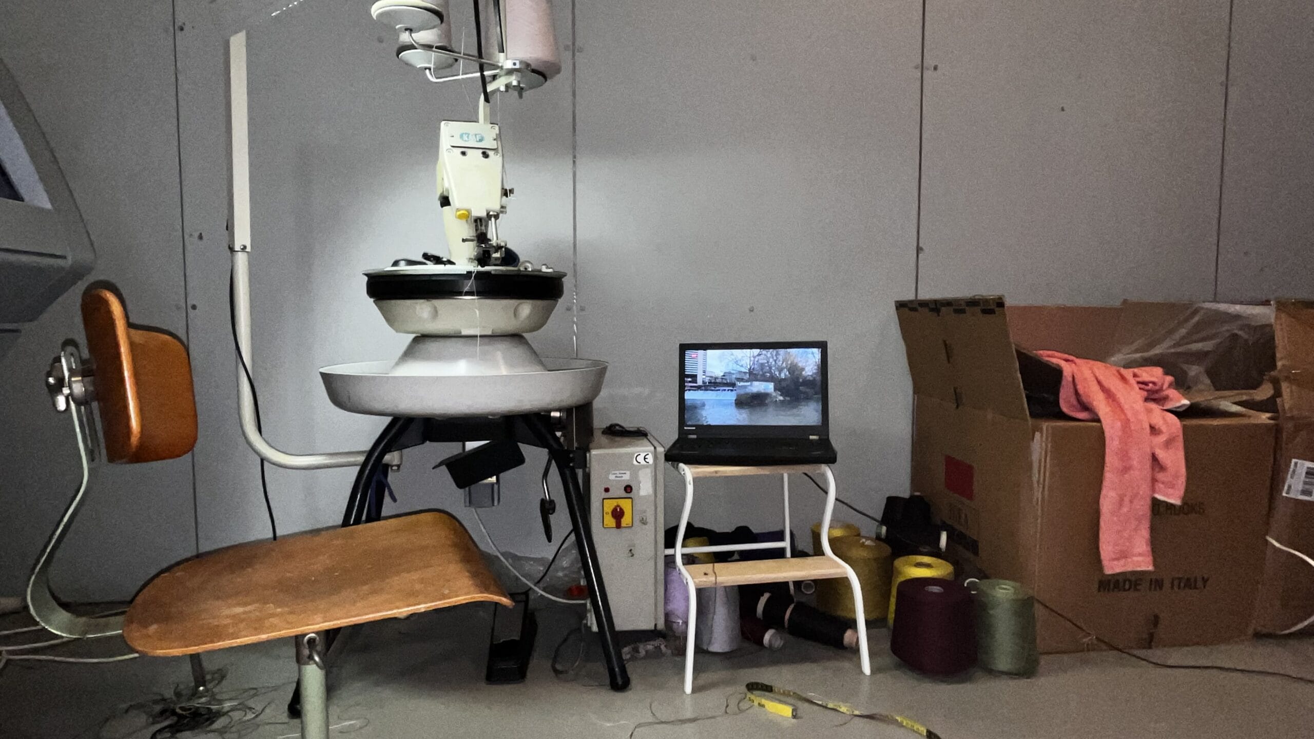 Während du auf deine Bestellung wartest, beginnt in der Strickerei die Arbeit: Die Strickmaschinen werden programmiert und mit den Garnen in deinen Farben eingefädelt. Dann wird gestrickt – Zeile für Zeile entsteht dein Pullover, nahtlos aus einem Stück.
